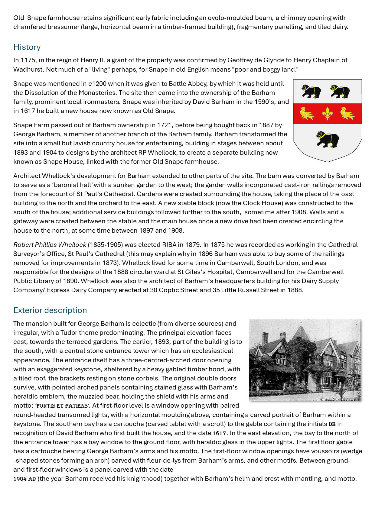 1895 Sudbury Lodge, Wembley, the home of Sir George T. Barham, founder of the Express Dairy. He purchased the Copland estate in 1895, renaming Sudbury Lodge as Barham House. On his death in 1937 Titus Barham, son of Sir George, left Barham House and its grounds to the new Wembley Borough Council. Had he not died he would have been the Borough's first Mayor. The Council neglected the main house so badly that it had to be demolished in 1956-7. (Courtesy Landed families of Britain and Ireland and Brent Council)