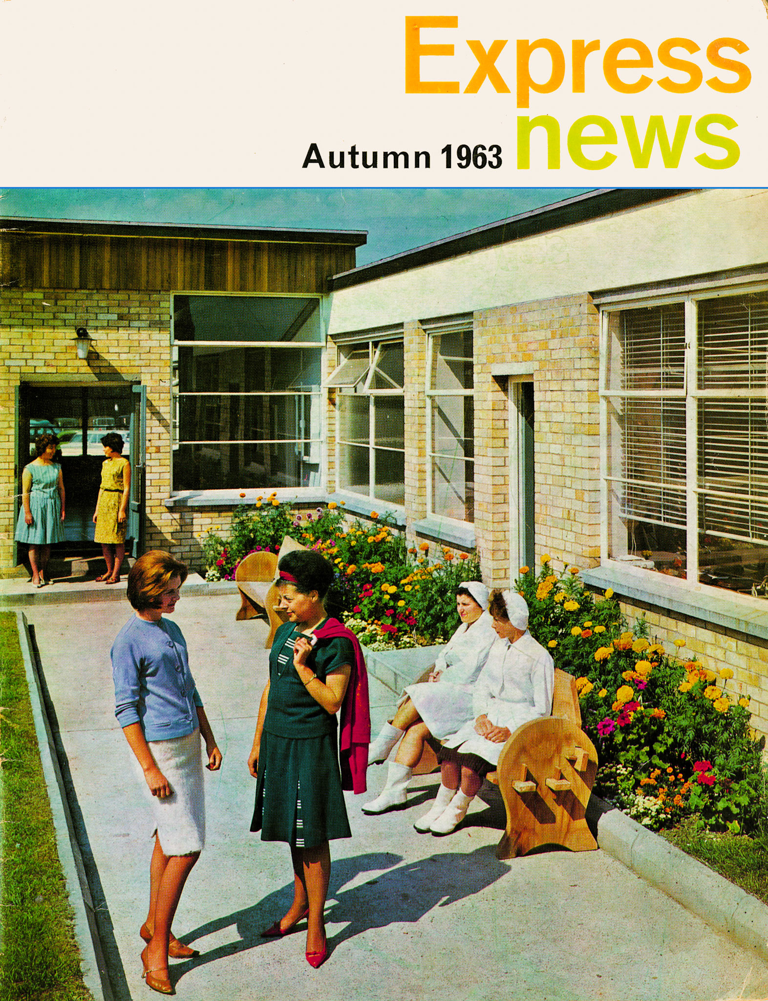 1965 "Framed against the solid girth of the Queen's Hotel, Eastbourne, our model guests enjoy a shaft of English sunshine." Express News Summer/Autumn Front Cover